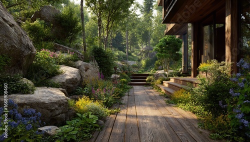 paseo, deck, wooden, garden, house, modern, flower, plant, tree, rock, scenic, bright, elegant, path, landscape, greenery, architecture, exterior, home, design, outdoors, serene, nature, beautiful, facades, stylish, contemporary, entrance, park, forest, tree, stone, pathway, summer, grass, bridge, stair, wood, step, road, footpath, way, ancient, walk