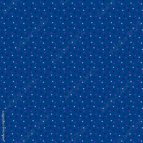 Bright simple geometric polka dot seamless pattern Tiny white, black, pink polka dots on a dark blue background Minimalistic festive design