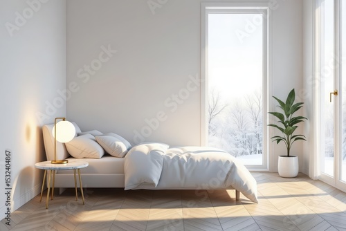 Bright small apartment style, minimalist bedroom with large window revealing snowy landscape. Concept of bright small apartment style, bright interior, calm and airy atmosphere.