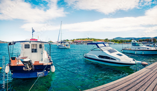 Bright spring scene of the Porto Rafti port. Sunny morning seascape of Aegean sea, Greece. Traveling concept background.