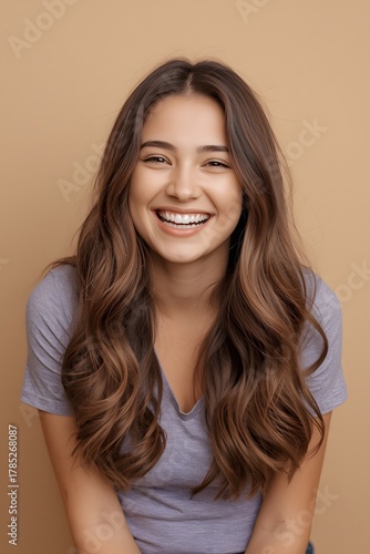 woman, portrait, smile, beauty, studio, beige, fashion, happy, youth, expression, model, natural, style, emotion, feminine, confidence, cheerful, aesthetic, hair, casual attire, charme, warmth, glow, soft, modern, elegance, background, wallpaper, positivity, serene, friendly, face, radiant, inspiration, simplicity, attitude, vibe, comfort, calm, brunette, joyful, lifestyle, harmony, gentle, presence, personality, brightness, freshness