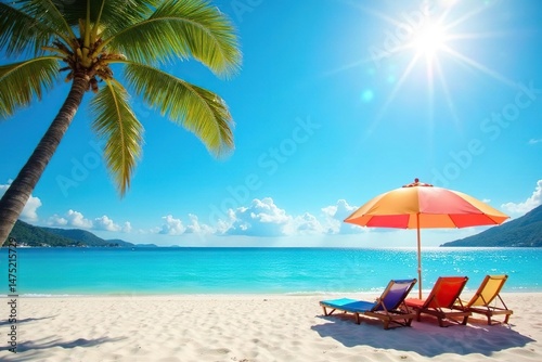 Bright summer sun shining on a vibrant beach scene with colorful beach umbrellas and clear blue water , clouds, beach