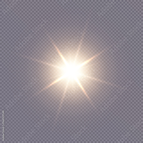 Bright sun shines with warm rays, vector illustration Glow gold star on a transparent background. Flash of light, sun, twinkle. Vector for web design and illustrations.