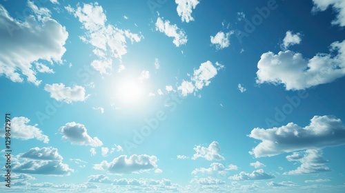 Bright sunburst, expansive blue sky, fluffy white clouds, heavenly atmosphere, high contrast, lens flare, celestial light, daytime sky, optimistic mood, uplifting scene, nature photography,