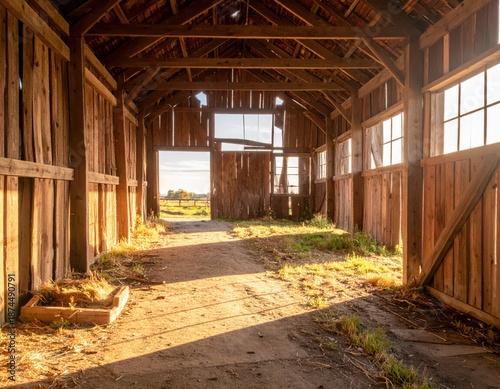 Bright Sunlight Illuminates Rustic Barn Interior with Wooden Framework