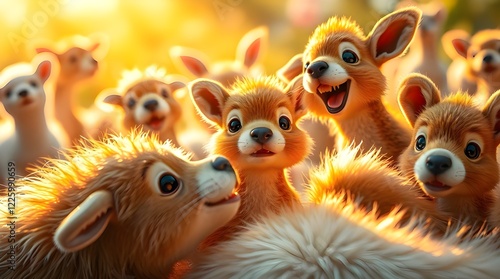 Bright vibrant colors, warm golden hour light, cute animals, soft light, lively and energetic scene, detailed fur textures