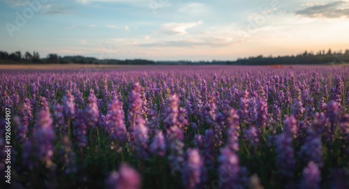 Bright violet flower meadow spreading across a calm natural setting with gentle sky