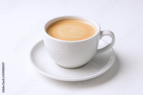 Bright White Coffee Cup with Saucer Filled with Creamy Latte on White Background.