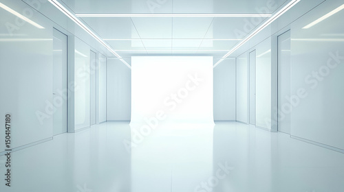 corridor, hallway, white, bright, modern, futuristic, clean, sterile, minimalist, architecture, interior, design, space, empty, light, reflective, shiny, smooth, geometric, line, wall, floor, ceiling, perspective, tunnel, abstract, background, technology, science, studio, building, room