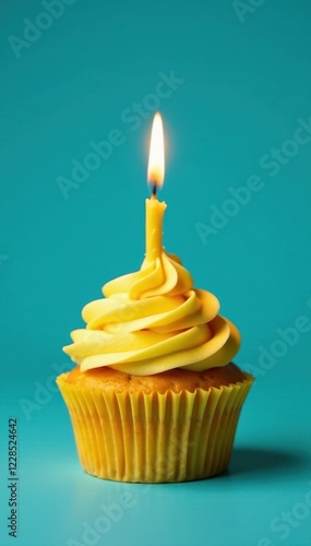 Bright yellow cupcake with burning candle against a vibrant blue backdrop, dessert, background