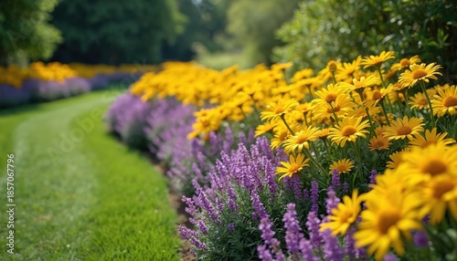 Bright yellow daisies and purple lavender border a winding garden path. Lush green grass curves around flower beds. Trees and foliage form a verdant backdrop.