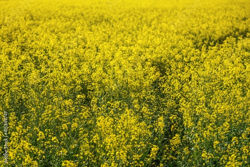 Bright yellow rapeseed Brassica napus flowers growing on field.