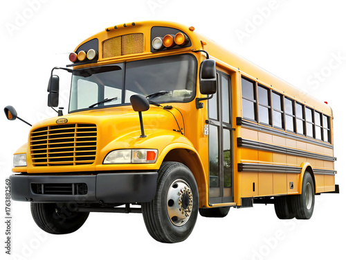 school bus, transportation, vehicle, public transport, education, travel, children, commute, road trip, journey, wheel, tire, door, headlamp, grille, mirror, exterior, half face, bright yellow, white background