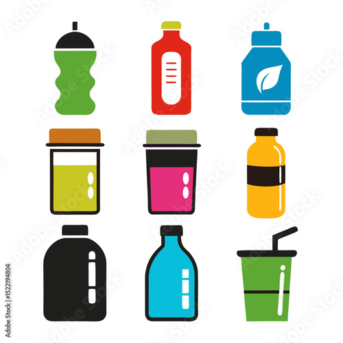 bottle, cup, water bottle, container, drink, beverage, liquid, juice, cartoon, graphic, icon, vector, bright, colours, green, red, blue, black, yellow, pink, orange, healthy, fitness, sport, lifestyle, illustration, minimalist, modern, clean, refreshment, thirst, package, product, diet, design, isolated, cut-out, white background