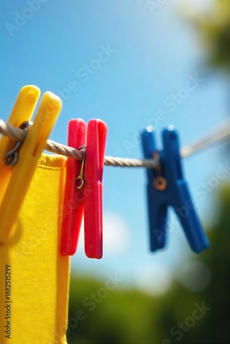 Brightly colored clothes pegs clipped to a taut clothesline, drying laundry in the sunshine A classic summer scene of simple domesticity and fresh air , bright, rustic, sunshine