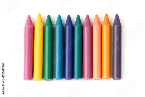 Brightly colored crayons displayed in a neat row, showcasing a variety of hues against a plain backdrop for a simple and striking appearance