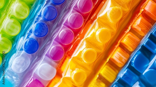 Brightly colored inflatable mattresses lined up in vibrant rainbow hues, showcasing a spectrum of vivid colors. Ideal for summer fun and relaxation by the pool or beach.