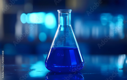 Brilliant Blue Experiment: A glass Erlenmeyer flask filled with deep blue liquid, representing precision and discovery in scientific research
