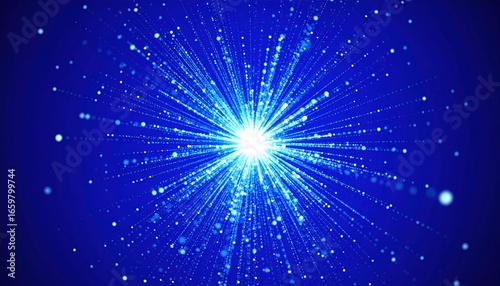 Brilliant burst of light in blue space with radiating rays and sparkling particles.
