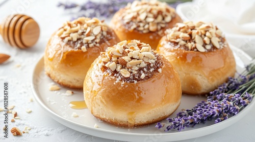 Brioche rolls topped with honey and almonds, isolated on a white plate background with decorative lavender sprigs and honeycomb