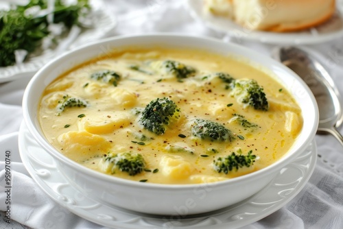 Broccoli cheese soup on white plate with cloth