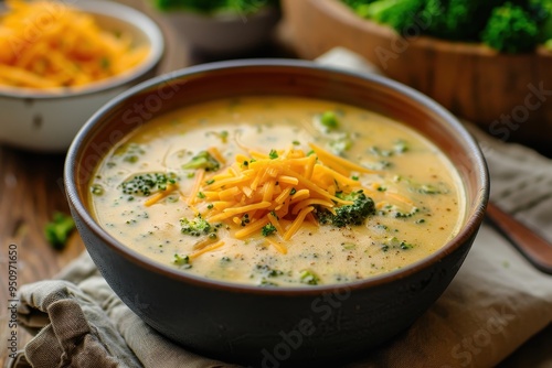 Broccoli soup in bowl on table