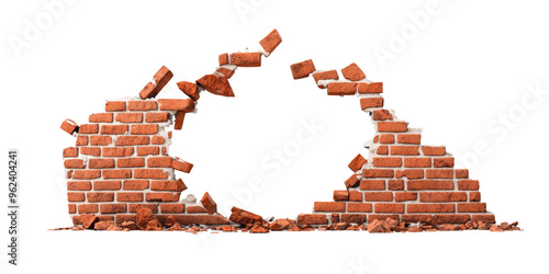 Broken brick wall with a large hole, representing destruction and freedom with scattered bricks on the ground