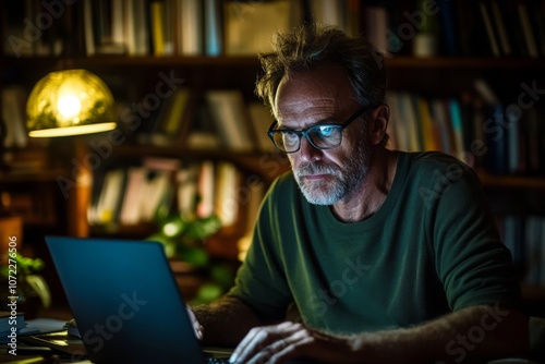 broker, reviewing, office, document, desk, light, background, work, professional, ambient, serious, male, middle-aged, focused, laptop, paper, indoor, night, studying, analysis, reading, paperwork, quiet, goggles, bookshelf, illuminated, concentration, workspace, task, detail, technology, writing, business, organised, effective, manager, environment, career, planning, strategy, information, research, content, session, arrangement, modern