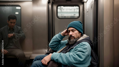 homeless, sad, thoughtful, subway, train, crisis, loneliness, man, social, brooding, sitting, passenger, beard