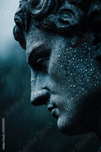 statue, rain, sculpture, stone, face, water, droplet, expression, melancholy, texture, moody, grey, blue, wet, art, detail, classic, emotion, solitude, architecture, sombre, ancient, cultural, mysterious, thoughtful, visage, rainfall, atmosphere, historic, dramatic, wetness, head, artistic, rainstorm, monolithic, heritage, serenity