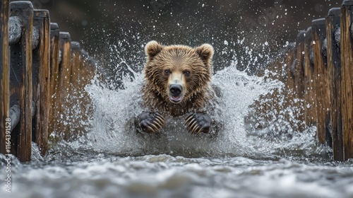 bear, wildlife, animal, brown, nature, water, splash, wild, mammal, predator, running, jump, action, grizzly, fur, claw, teeth, forest, power, strength, speed, aggressive, danger, hunting, fishing, river, stream, wet, drop, spray, motion, dynamic, outdoors, wood, wilderness, europa, russia, kamchatka, fauna, zoology, vertebrate, cute, funny, playful, baby animal, swimming, bathing, portrait