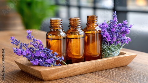 Brown bottles filled with oils are placed on a wooden tray beside fresh lavender in a well-lit space with greenery