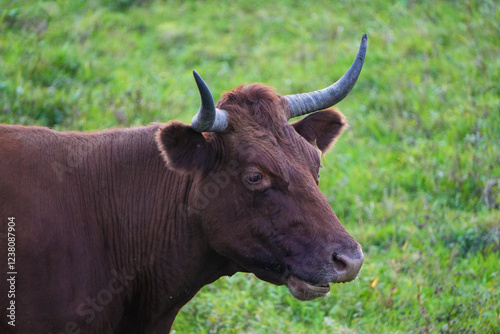 bull, cow, cattle, farm, farm animal, animal, brown, horned, strong, nature, agriculture, rural, mammal, grass, domestic, powerful, bovine, horn, pasture, wildlife, countryside, field, ranch, farming, beef, horn, muscular, standing, outdoors, closeup