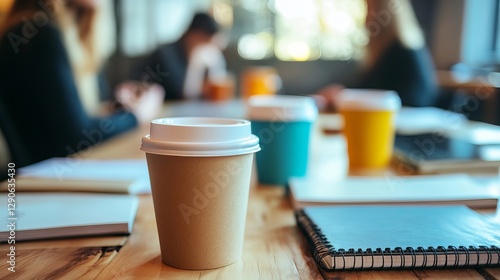 Brown Coffee Cup on Wooden Table Notebook Background Blurred People Working Office Meeting Workspace Cozy Atmosphere Creative Team Brainstorming