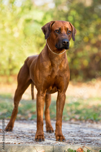 Brown dog Rhodesian Ridgeback standing in park and looking