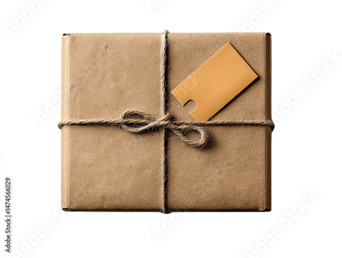 Brown gift box tied with twine and blank tag, isolated on a white background.