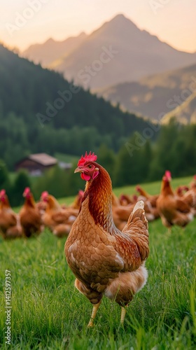 Brown hen standing in green grass field with other chickens grazing in background at sunset with mountain view, representing organic farming and healthy lifestyle