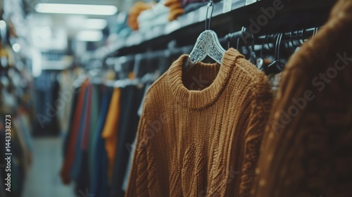 sweater, knitted, clothing, fashion, store, apparel, brown, retail, hanger, shopping, cosy, wool, garment, warm, texture, clothes rack, fall, winter, casual attire, stylish, knitwear, material, soft, comfortable, merchandise, display, interior, aisle, blurred, depth, sharpened, realistic, design, pattern, thread, showcase, urban, marketplace, boutique, outfit, choice, purchase, closeup, style, neat, organised, seasonal, bulk