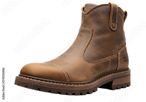 Brown leather work boot isolated on white, durable footwear for construction and outdoor activities