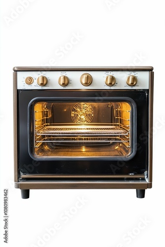 oven, appliance, kitchen, baking, cooking, heat, warm, light, electric, brown, white, gold, knob, control, temperature, timer, interior, door, glasses, rack, metal, grate, isolated, white background, domestic, household, modern, design, contemporary, built-in