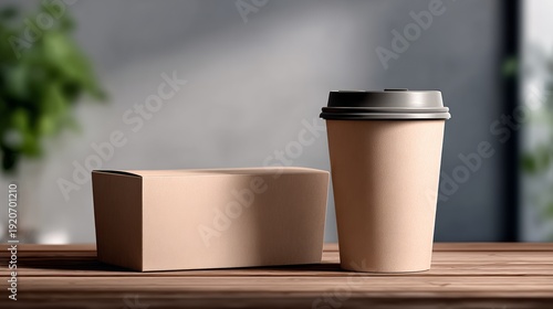 Brown paper coffee cup with a black lid next to a plain cardboard box on a wooden table, soft natural light illuminating the scene
