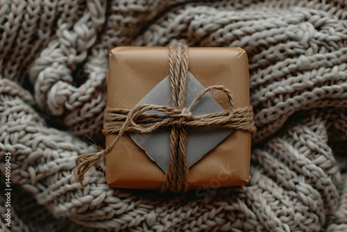 twine, gift, present, envelope, knit up, blanket, cosy, warm, cardboard box, holiday, celebration, surprise, rustic, simple, elegant, hand-made, craft, design, background, still life, topview, detail, texture, comfort, wool, textile, fabric, pattern, beige, brown, grey, natural, organic, festive, season, giving, wrapped, paper, string, ribbon, closeup, mail, correspondence