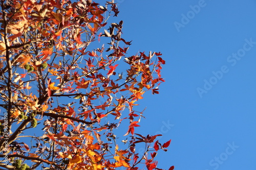 Brown, red, yellow and orange leaves on trees, hedges and the ground during Fall