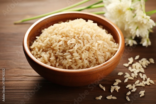 Brown rice in wooden bowl with flower