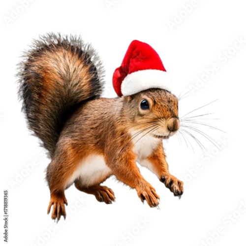 Brown Squirrel Leaping with Red Santa Hat, Side View, Isolated on Transparent Background PNG
