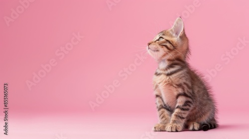 kitten, cat, tabby, brown, pink, background, curious, looking, upwards, gaze, sitting, small, animal, pet, felino, domestic, cute, adorable, fluffy, soft, fur, eye, whisker, paw, tail, portrait, photo, studio, image, photo