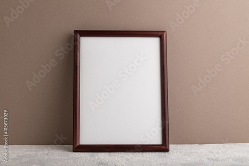 Brown wooden frame mockup on beige paper background. Blank, vertical orientation, still life.