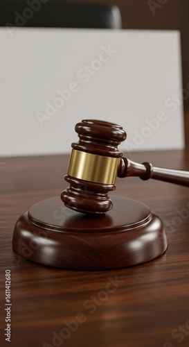Brown wooden judge gavel and legal block resting on a polished courtroom desk. Law, justice, and auction concept for website or book cover design.