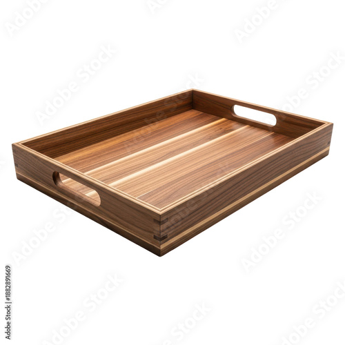 Brown wooden tray with handles on transparent background for serving food and drinks