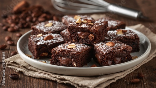 Brownies Cake, rich fudgy chocolate cake with shiny cracked top, cut into neat squares and dusted with powdered sugar, indulgent dessert visuals with detailed texture